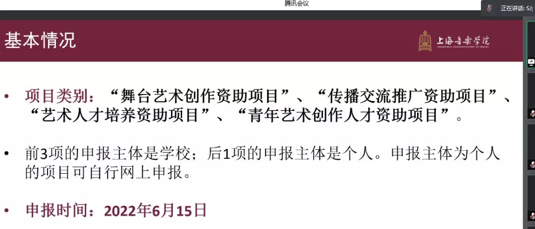 4月5日晚7时,音乐学院通过腾讯会议视频形式,召开2022年度国家艺术基金申报线上推进会,邀请了上海音乐学院科研处副处长孙剑博士作项目申报学术报告。王静怡院长参加了报告会议并讲话,副院长董博超主持了会议。
