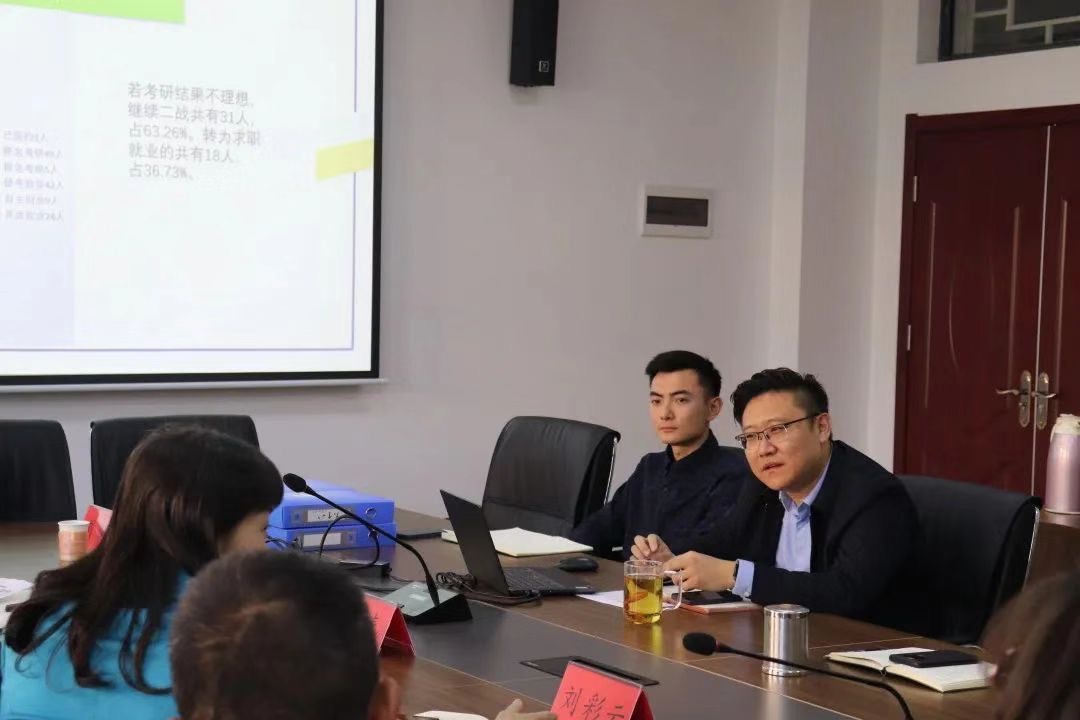 多措并举,打造就业工作全员化、网络化、多元化、精准化。院长王静怡着重介绍了学院“辅导员、班主任、专业教师、大课教师“四级帮扶机制”,引领全院教师牢固树立育人和就业考研指导的全员参与的理念。院党委副书记司现鹏就学生安全稳定工作、毕业生就业和考研工作进行了汇报。