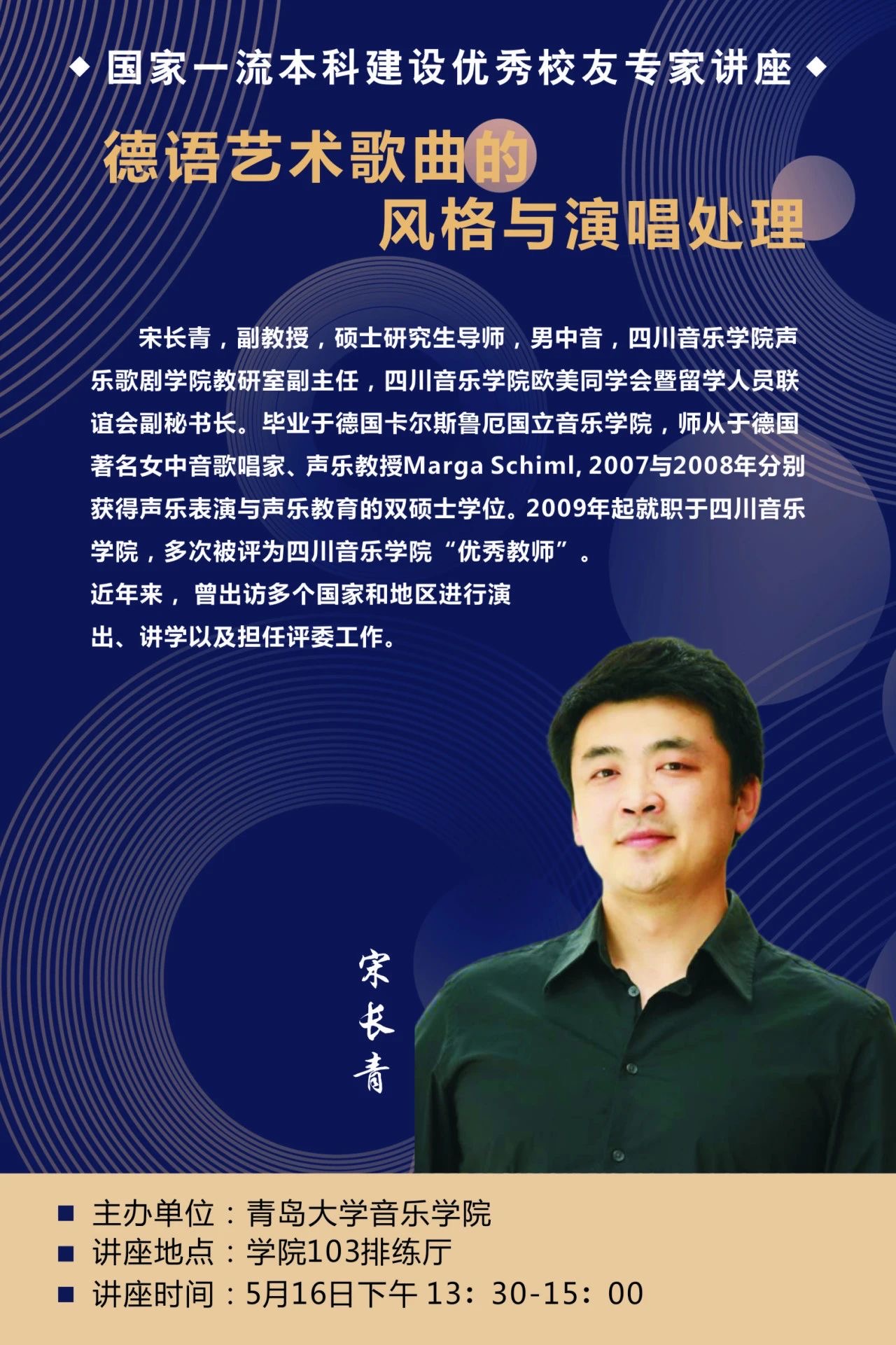 宋长青,副教授,硕士研究生导师,男中音,四川音乐学院声乐歌剧学院教研室副主任,四川音乐学院欧美同学会暨留学人员联谊会副秘书长。毕业于德国卡尔斯鲁厄国立音乐学院,师从于德国著名女中音歌唱家、声乐教授Marga Schiml,2007与2008年分别获得声乐表演与声乐教育的双硕士学位。2009年起就职于四川音乐学院,多次被评为四川音乐学院“优秀教师”。近年来,曾出访多个国家和地区进行演出、讲学以及担任评委工作。