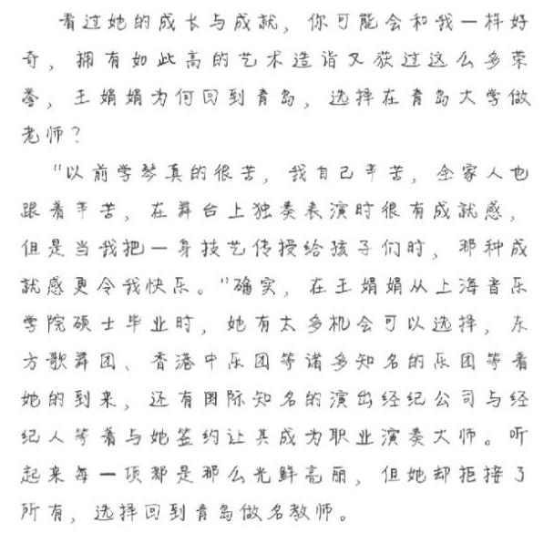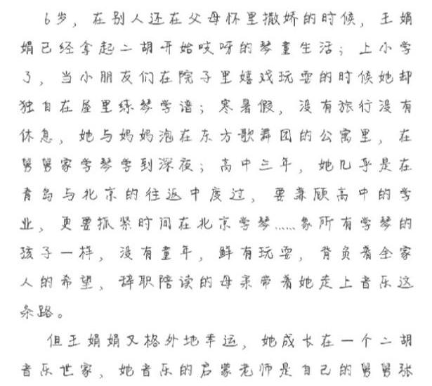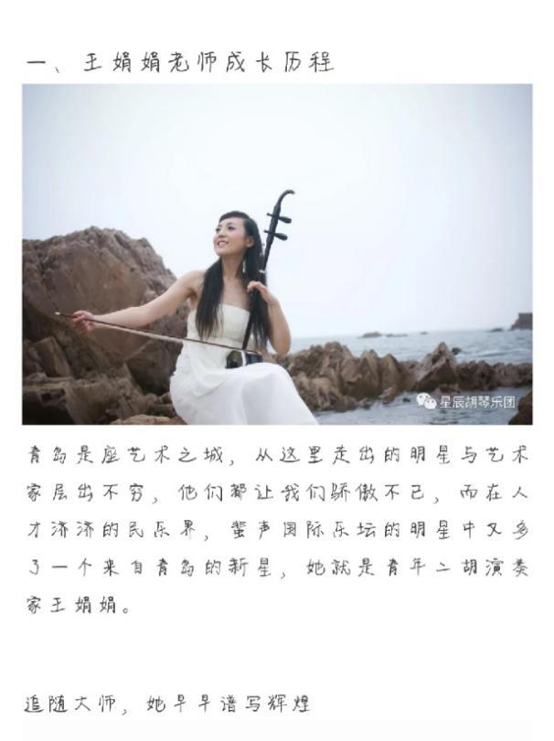 艺术经历:王娟娟的演奏风格博采众长,声情并茂,弓弦凝练,音色深邃,曾多次举行国内及国际巡演,主要国家包括:德国、奥地利、法国、英国、比利时、瑞士、荷兰、日本、韩国、菲律宾等地,并多次在欧洲、上海、青岛成功举办个人独奏音乐会,与胡琴大师张玉明教授共同录制的“爱艺术——跟着全世界艺术家学艺术”专题讲座,已上线并全球发行。曾举办中国民族器乐艺术专题讲座百余场。2019年、2020年两年期间在青岛电台、电视台直播二胡演奏及理论课程近百期。