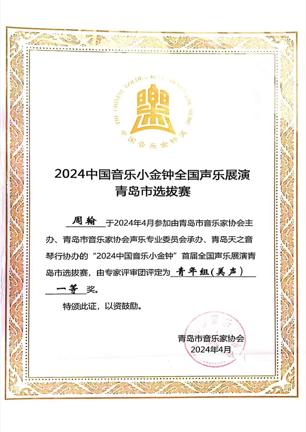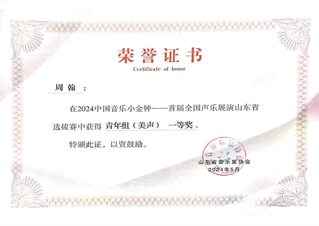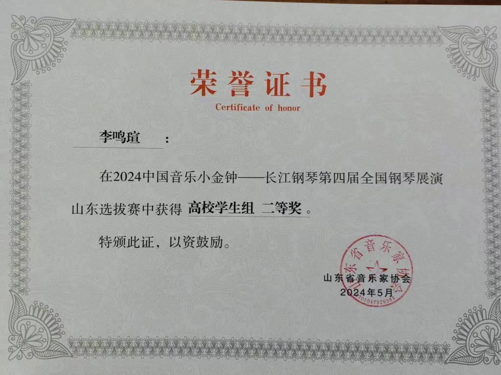 而同样令人骄傲的是,音乐学院研究生周翰同学,在“2024年中国音乐小金钟”首届全国声乐展演山东省选拔赛中,展现出非凡的实力,荣获“青年组(美声)一等奖”。李鸣瑄同学在“2024年中国音乐小金钟”—长江钢琴第四届全国钢琴展演山东选拔赛中荣获“高校学生组 二等奖”。