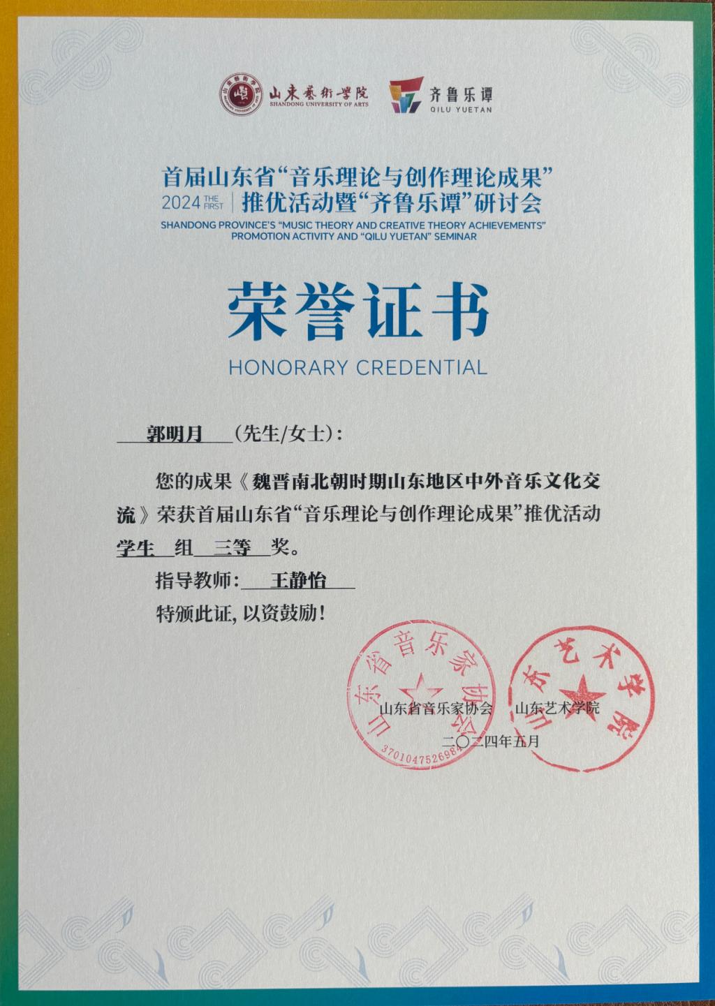 院长王静怡教授指导21级硕士研究生郭明月撰写的文章《魏晋南北朝时期山东地区中外音乐文化交流》发表于《音乐文化研究》(浙江音乐学院学报)第21期,在本次比赛中荣获学生组三等奖!