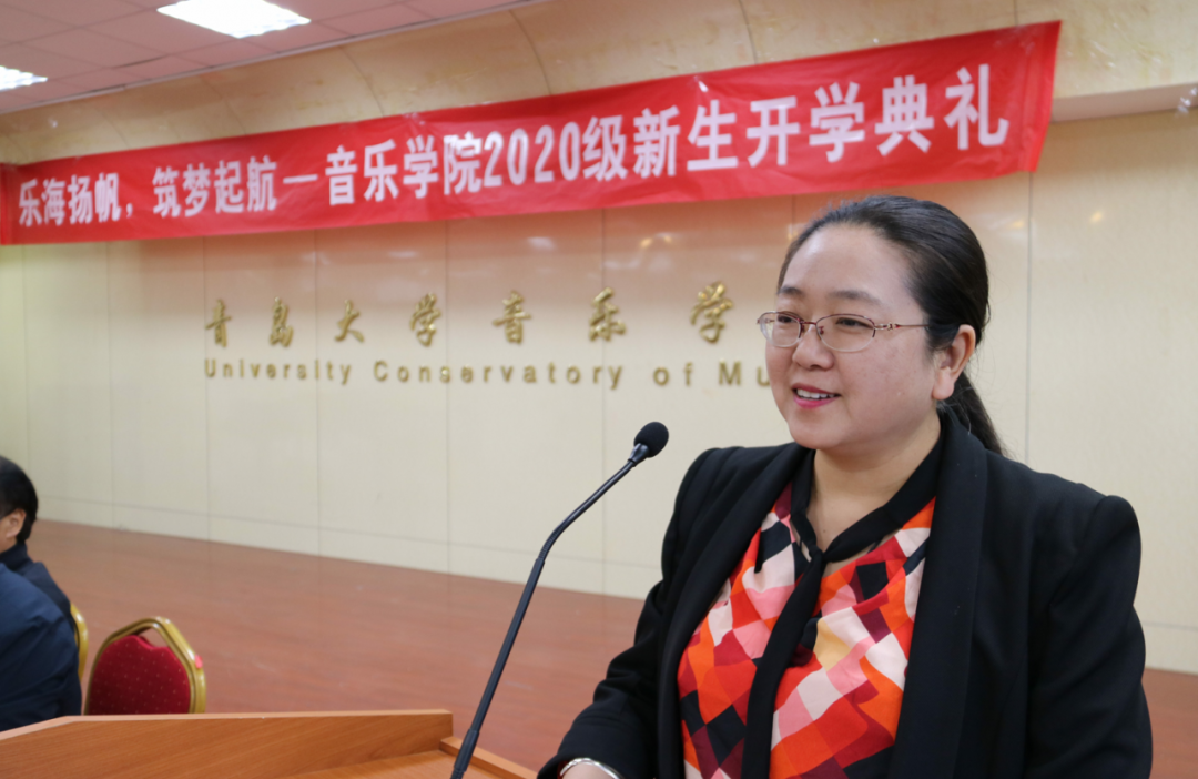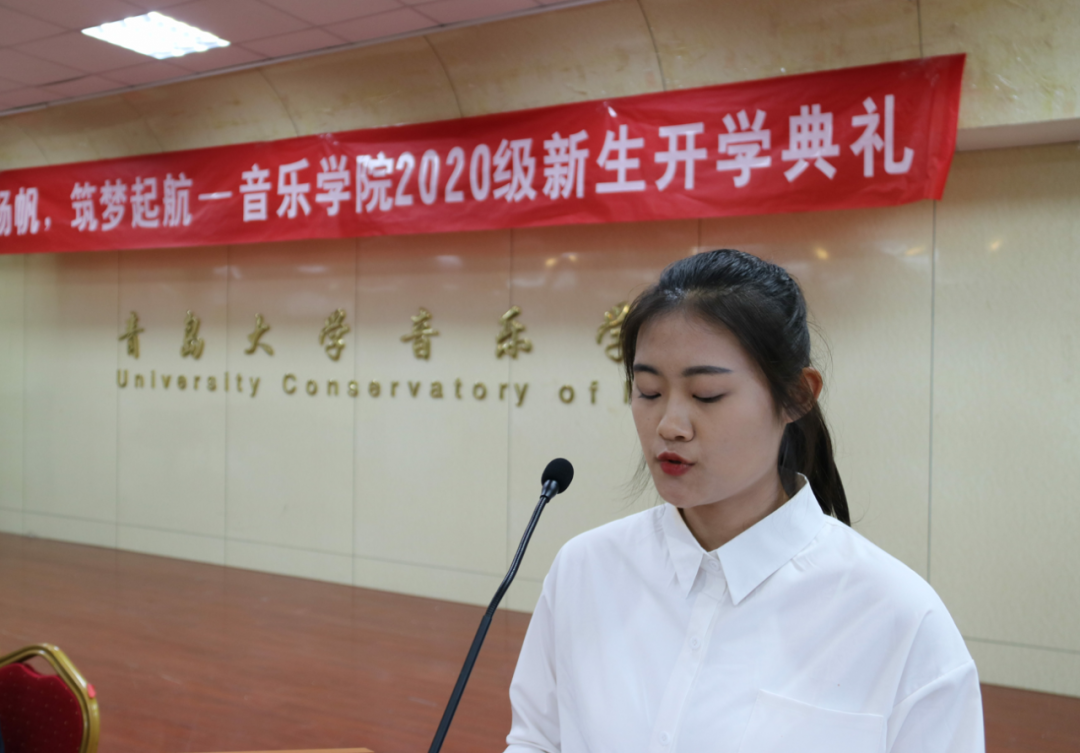 2020级音乐学专业的吕茹倩代表新生发言,她向2020级新生发出三点倡议:第一,明确目标,虚心好学,博采众长;第二,学以致用,勇于开拓,善于创新;第三,提高素质,加强素养,接受挑战。
