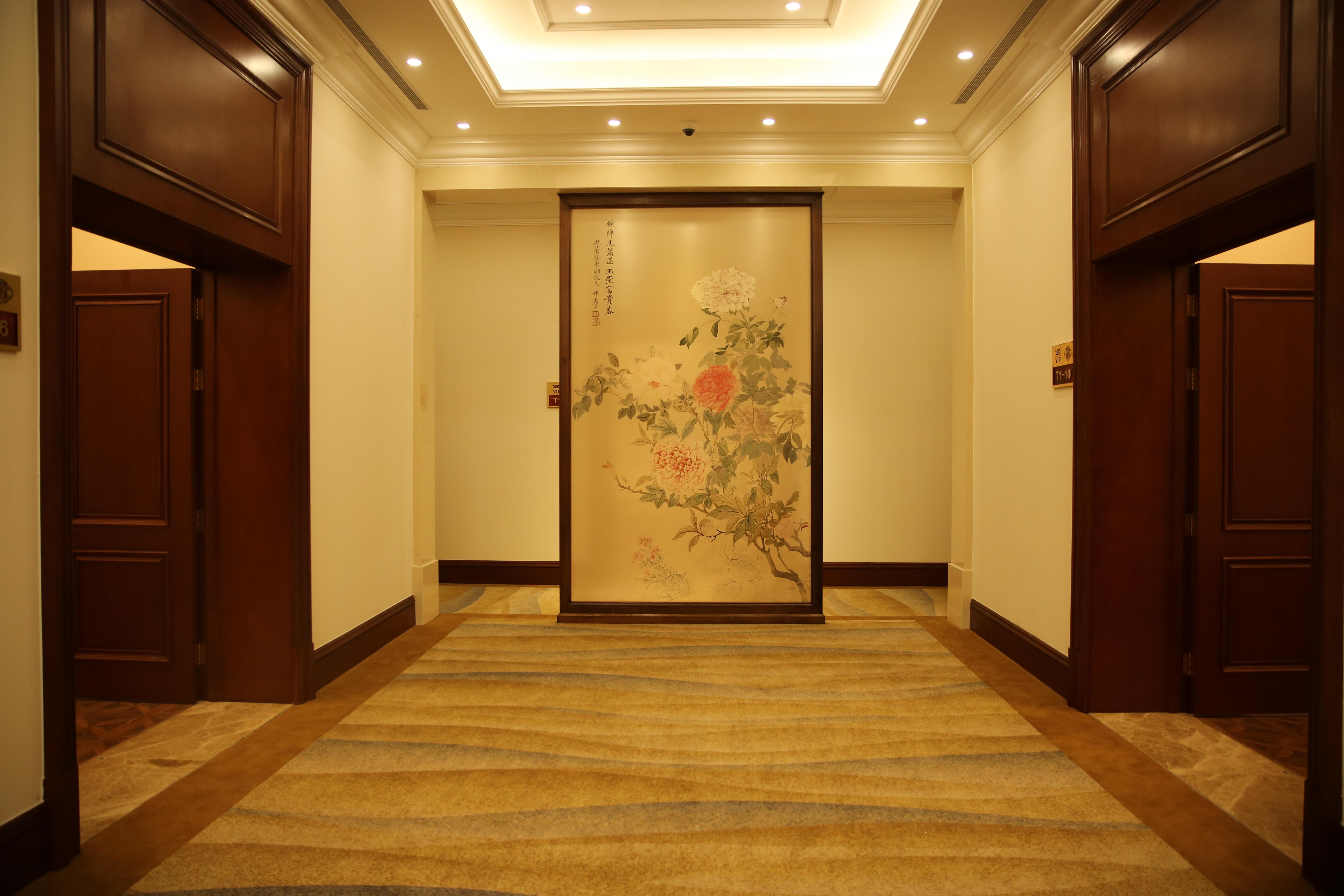 在走廊处,放置了绢制的屏风,上面描绘了国画牡丹盛开的场景,结合棕红色的实木外框,给人大气雅致的感受。绢微透的材质在室内的光线下别有一番韵味。