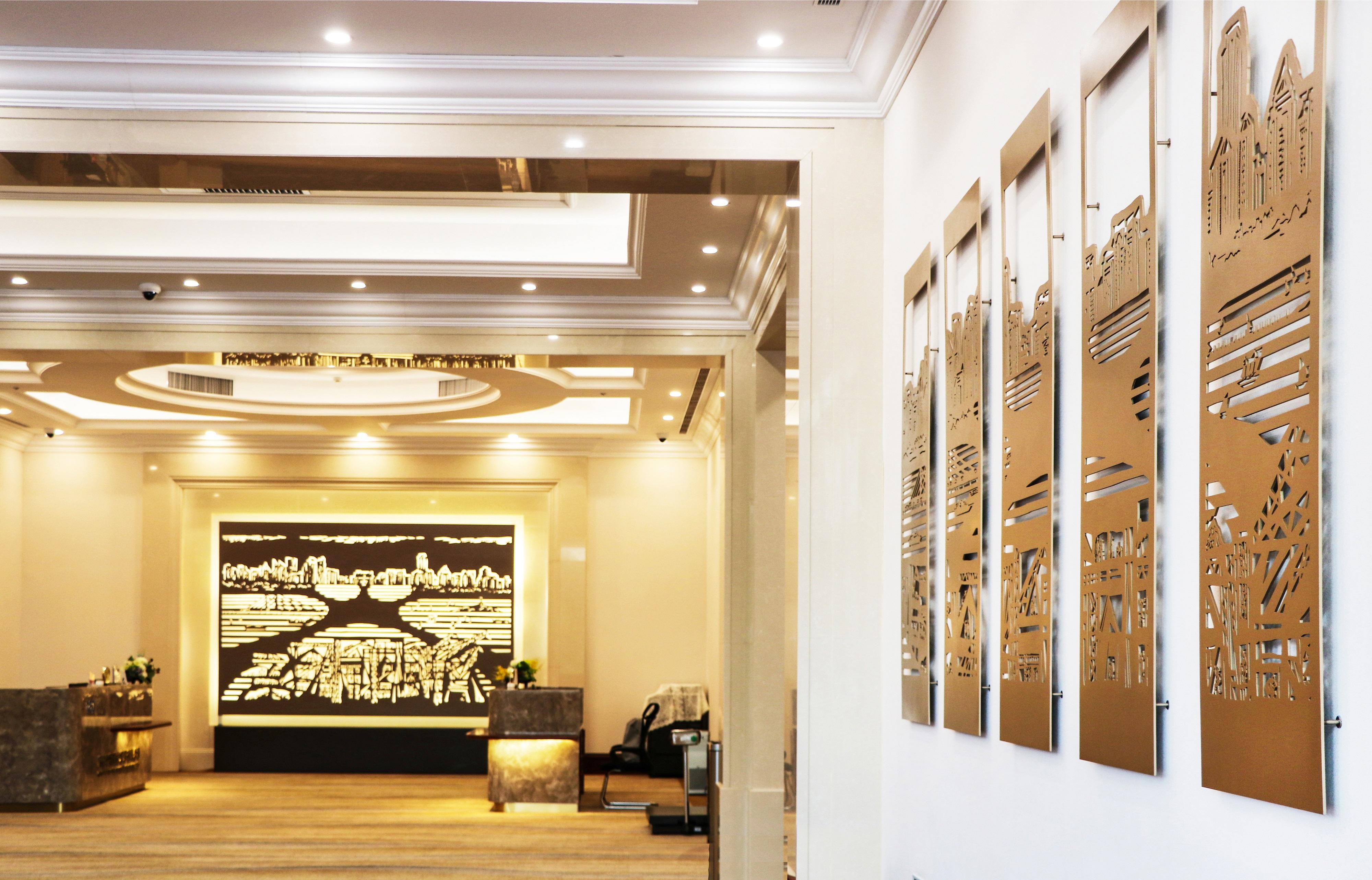 精巧秀美的《启程青岛——城市码头》主题金属板系列装置作品以中国剪纸语言的叙事风格和手法,呈现青岛的城市风貌和人文特点。以青岛临海而立、依山半岛的自然地理特点为背景,以繁华忙碌的现代机场和海运码头为中心图式,对应都市建筑丛林和红瓦绿树的人文自然景观,动静结合,展现青岛现代化大都市的城市人文风貌。作品以金色不锈钢透雕为材料技艺,配合暖白色光源映衬镂空剪影效果。作品以刚劲有力的几何风格与阴刻线镂空剪影为艺术语言。