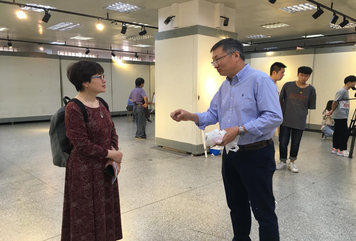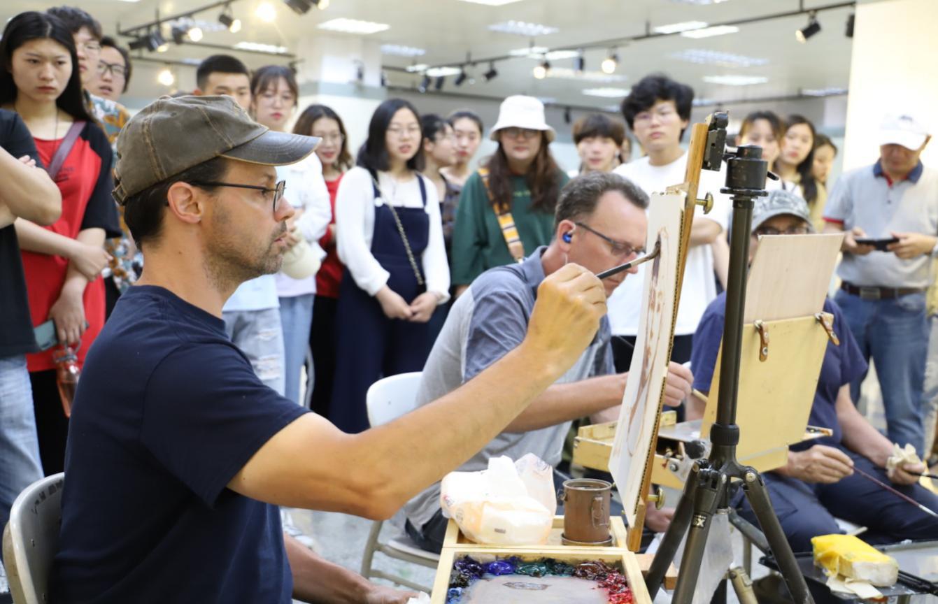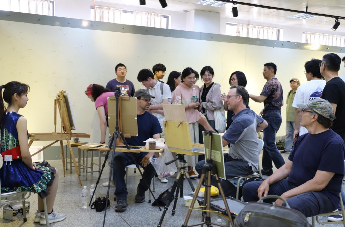 艺术无国界,文化有共识,为提高美术学院本科教学国际化水平,开拓学生视野,增进中美艺术交流,5月24日上午美术学院邀请以旅美著名油画家司徒绵先生为代表的10位旅美画家与美国画家来到学院进行人物肖像写生示范,下午在笃行楼模拟法庭司徒绵先生为美术学院绘画系的师生做专题讲座《东方.西方---我的经历及绘画》。学院党委书记崔洪林、院长王绍波在一楼展厅热情迎接了艺术家们。