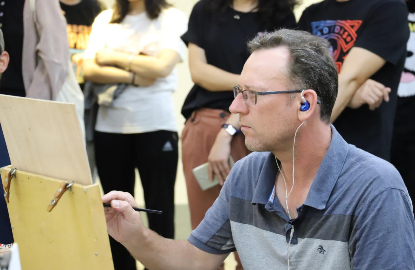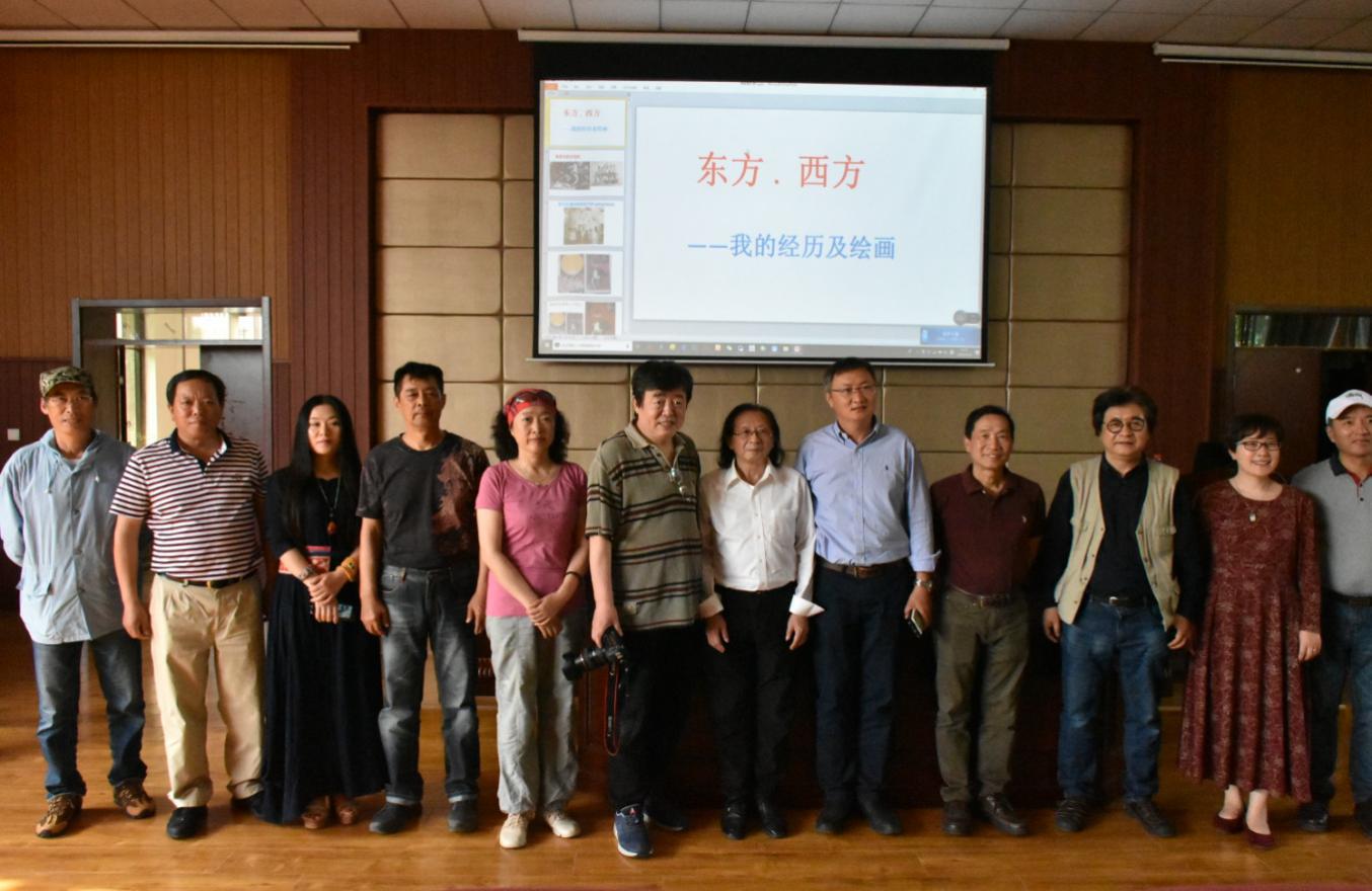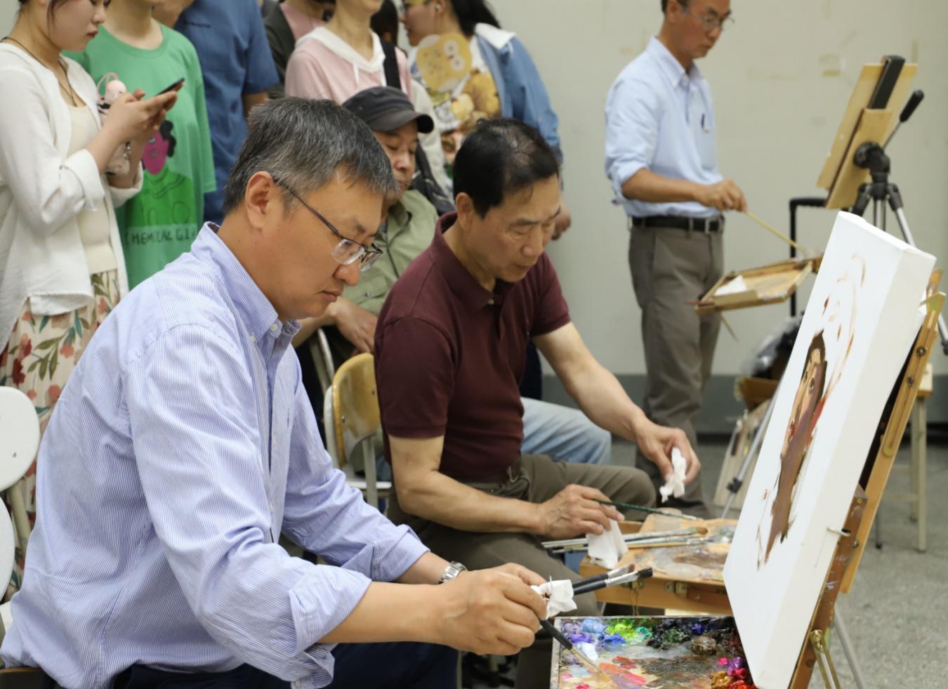 艺术无国界,文化有共识,为提高美术学院本科教学国际化水平,开拓学生视野,增进中美艺术交流,5月24日上午美术学院邀请以旅美著名油画家司徒绵先生为代表的10位旅美画家与美国画家来到学院进行人物肖像写生示范,下午在笃行楼模拟法庭司徒绵先生为美术学院绘画系的师生做专题讲座《东方.西方---我的经历及绘画》。学院党委书记崔洪林、院长王绍波在一楼展厅热情迎接了艺术家们。