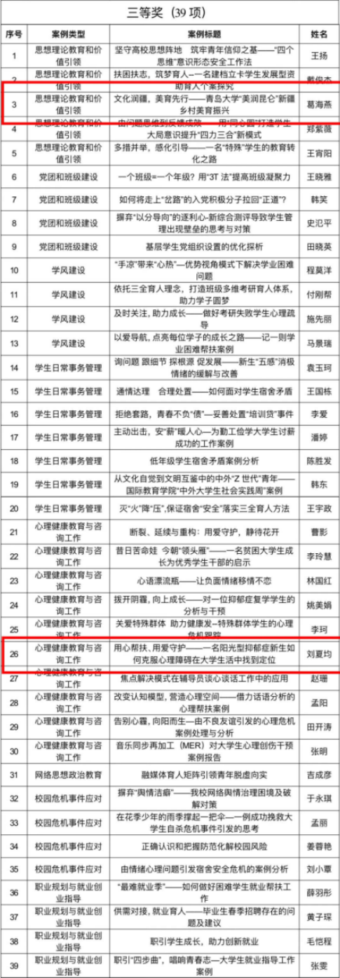 刘夏均老师在“心理健康教育与咨询工作”领域,凭借《用心帮扶、用爱守护——一名阳光型抑郁症新生如何克服心理障碍在大学生活中找到定位》案例斩获三等奖,生动诠释了心理育人工作中的温情与专业。