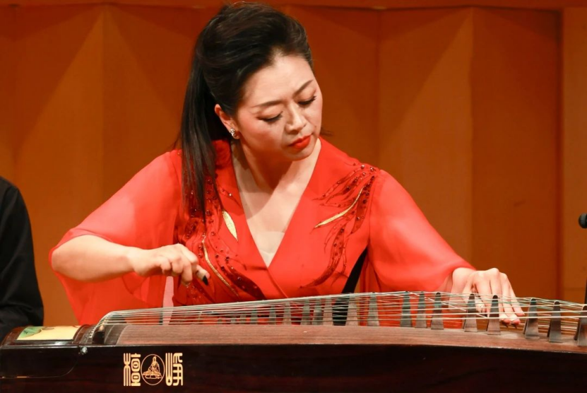 《金蛇狂舞》开场,民族乐团音乐骤响,琵琶扫弦如金蛇吐信,古筝划奏似银鳞跃动。鼓点激越如爆竹连响,二胡高腔穿云破雾,众乐齐鸣间,一条“金蛇”在旋律里腾挪翻卷,热烈欢腾的民俗风情扑面而来,瞬间点燃全场气氛。随后,《碰八板》古筝重奏以山东民间音乐为基底,旋律明快活泼,展现了传统民间音乐的灵动韵律。笛子独奏《敕勒歌》以笛音摹画“天苍苍,野茫茫”的辽阔草原,高低转合间尽现北方民族的豪迈风情;二胡重奏《赛马》则以激越的弓弦模拟马蹄奔腾,群琴齐鸣中仿佛可见草原上的竞技场景,将现场气氛推向高潮。阮齐奏《丝路驼铃》以中阮的醇厚音色串联起古丝绸之路的悠远记忆,颤音与滑音交织出驼队跋涉的沧桑感。压轴曲目融入朝鲜民族音乐元素的古筝重奏《柳京之舞》,琴弦跳动如裙裾翻飞,传递出中华民族共同体的优秀音乐文化