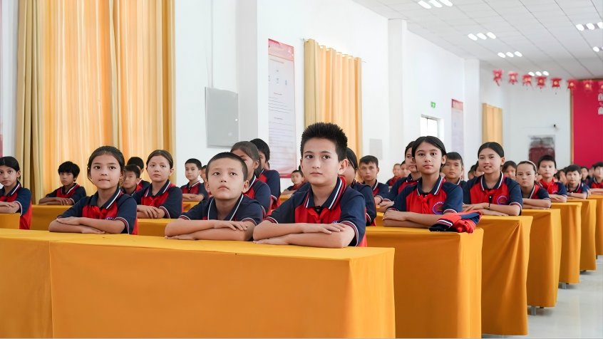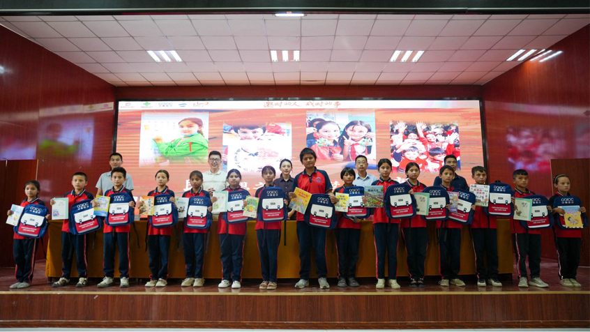 领导代表为加依乡学生代表赠予了书包、书本组合。十年跋涉,并非独行。中青国合以远见与担当,成为这场文化润疆壮举的坚实基石。从跨越千里送达的1500份书包文具,到团队行程与支教材料的鼎力支持,中青国合以实际行动完美诠释了“助理想之人,成梦想之事”的公益精神。