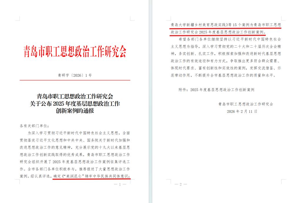 新疆乡村美育思政实践》等15个案例为青岛市职工思想政治工作研究会2025年度基层思想政治工作创新案例。这一荣誉,既是对学院深耕美育思政、践行文化润疆使命的高度肯定,也彰显了艺术教育在铸牢中华民族共同体意识中的独特价值与时代担当。
