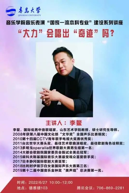 很多声乐爱好者与学习者都对美声唱法具有浓厚的兴趣,因为它高亢、明亮、浑厚、通透、松弛。但是想达到这些状态,只知道一味的“使大劲”就能达到吗?显然不是。在本场讲座中,我们将从声音技术、作品选择和学习习惯三个角度,来诠释这一问题。