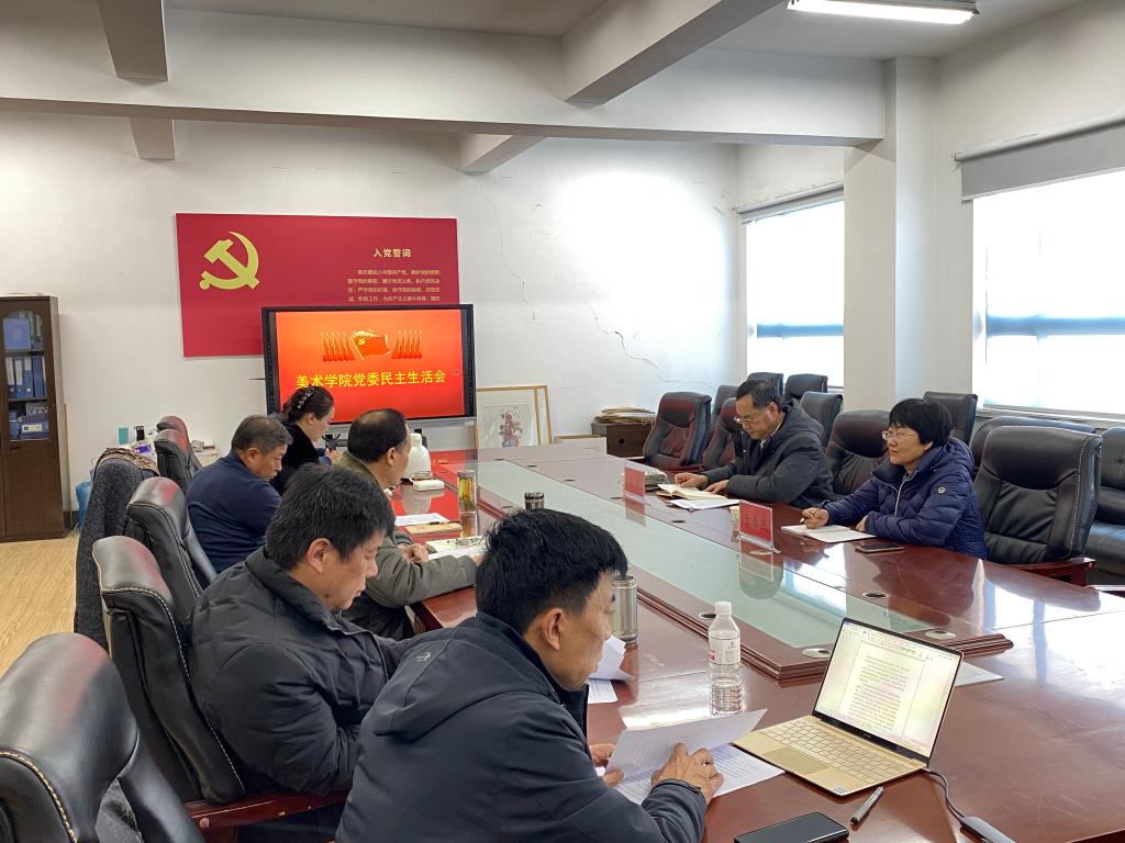 美术学院党委于2023年2月17日下午2点在中心校区东院德雅楼510室召开2022年度民主生活会,本次会议的主题是:全面贯彻习近平新时代中国特色社会主义思想,深刻领悟“两个确立”的决定性意义,增强“四个意识”、坚定“四个自信”、做到“两个维护”,团结带领党员干部群众以奋发有为的精神贯彻落实党的二十大作出的重大决策部署。民主生活会由美术学院党委书记杨成中主持,校党委常委、副校长李军、校纪委正处级纪检监察员于春燕参加指导美术学院党委民主生活会,美术学院党政领导班子全体成员参加会议。