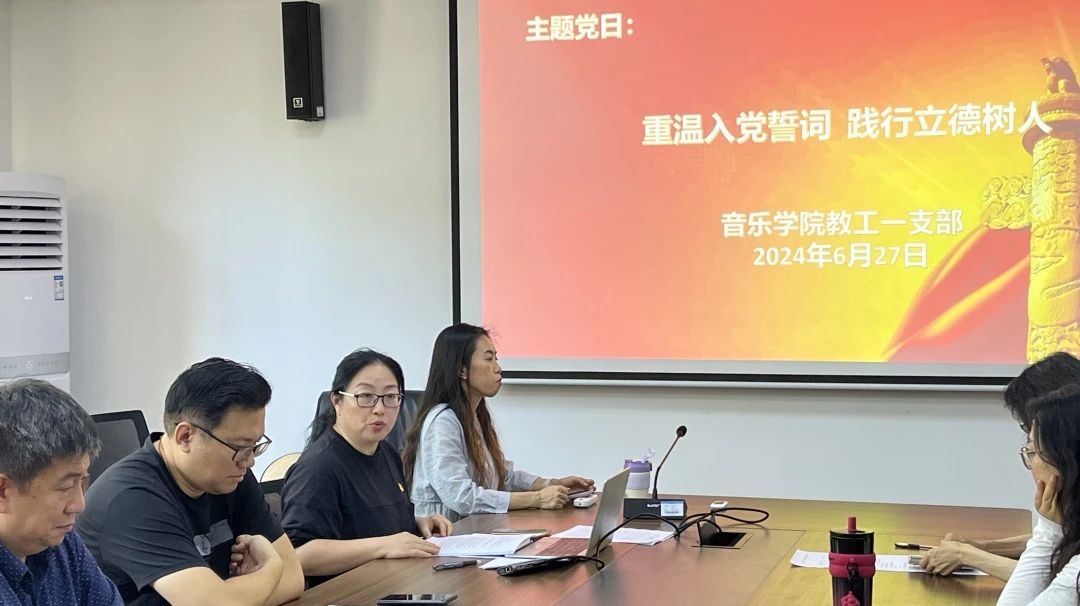 2024年6月27日下午,音乐学院教工第一支部在学院会议室召开支部大会,共同庆祝中国共产党成立103周年。支部书记王文俐同志主持会议,支部全体党员参加会议。