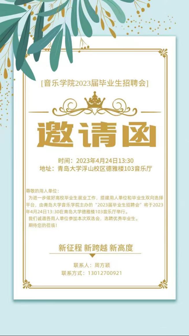 音乐学院拟于4月24日举行毕业生专场招聘会,诚邀用人单位参加。