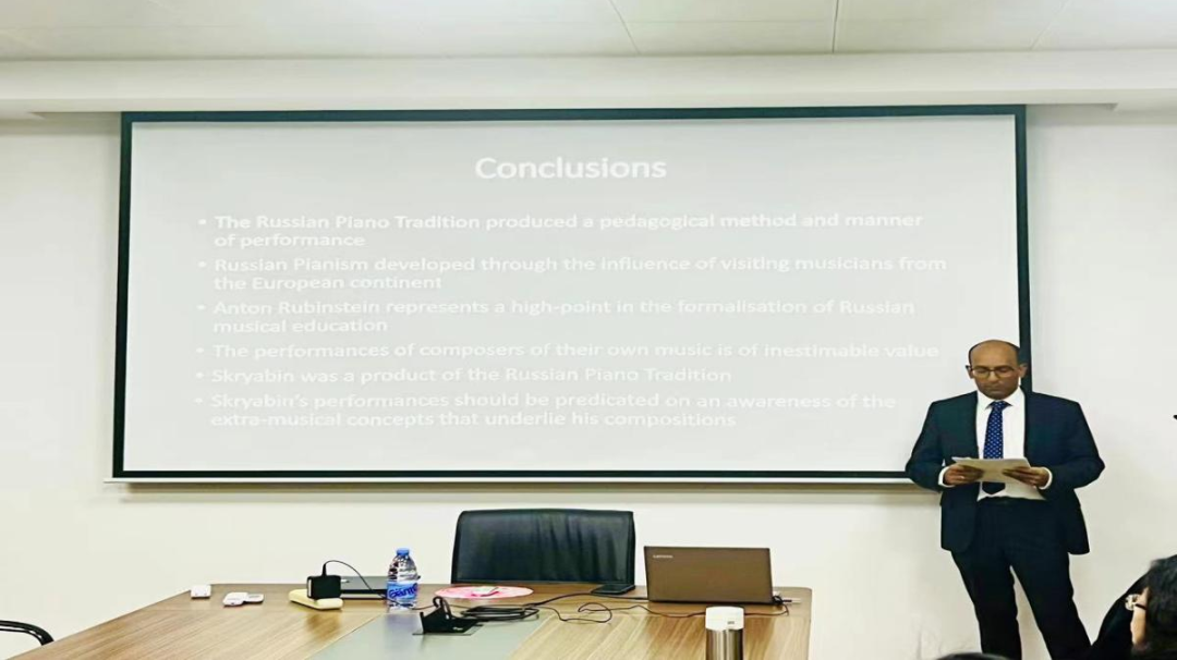 在讲座的上半部分,以俄罗斯钢琴学派建立的背景及代表人物展开,介绍了斯克里亚宾是如何在继承传统俄罗斯钢琴学派的基础上,通过独特的演奏美学和哲学思想,探索出新俄罗斯表演风格的。