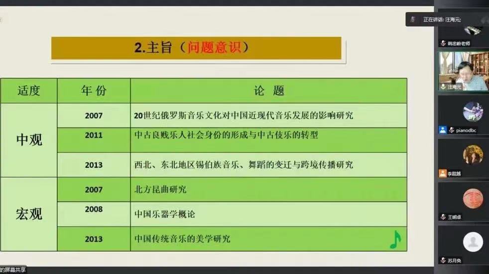 12月16日晚,音乐学院通过腾讯会议视频形式,邀请安徽师范大学音乐学院院长、博士生导师汪海元教授作学术报告,专门针对本院2023年度国家社科基金申报工作作专题辅导讲座。参加报告会的有学院申报项目的以及热心科研的教师,关注国家社科基金艺术学项目申报的我校其他院系有关老师,学院副院长董博超主持了会议。
